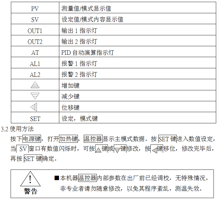 按下電源鍵,打開加熱鍵,溫控器顯示主模式數據。按SET鍵進入數值設定,當 SV窗口有數值閃爍時,可按 鍵或 鍵修改,按 鍵移位,修改完畢后,再按SET鍵確定