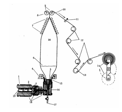 1、擠出料筒 2、過濾網 3、多孔板 4、風環 5、芯模