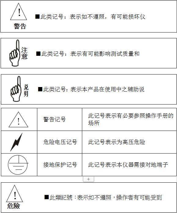 關于使用儀器時需注意的事項和防止意外及危險,請您務必遵守下列警告、危險、注意的顯示記號: