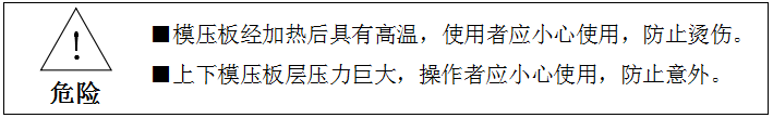 五、溫度達到后,將放有原料的料板置于加熱模板中間,按下合模鍵使模壓板上升合攏開始進行模壓程序。