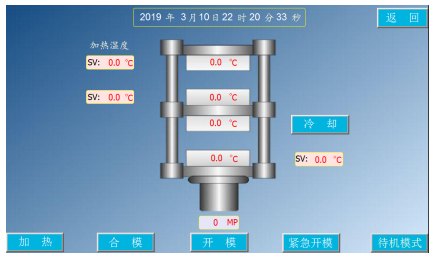 本系統(tǒng)為PLC可編程式觸摸屏控制,可設置壓力、溫度、硫化時間,排氣時間,排氣次數(shù),可實現(xiàn)程序化模壓程控,可動態(tài)顯示硫化進程,具有操作簡便,自動化程度較高的特點。