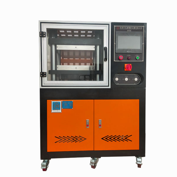 原料放于鑄模內,夾于本機電熱平板間加以壓力及溫度,使原料成型,以供試驗,做為工廠大量生產配料之依據。本機裝有PLC程序控制彩色觸摸屏,人機界面作業系統可設定壓力、溫度、時間和排氣次數,硫化過程實時顯示和監視,所設模壓程序全數自動完成。